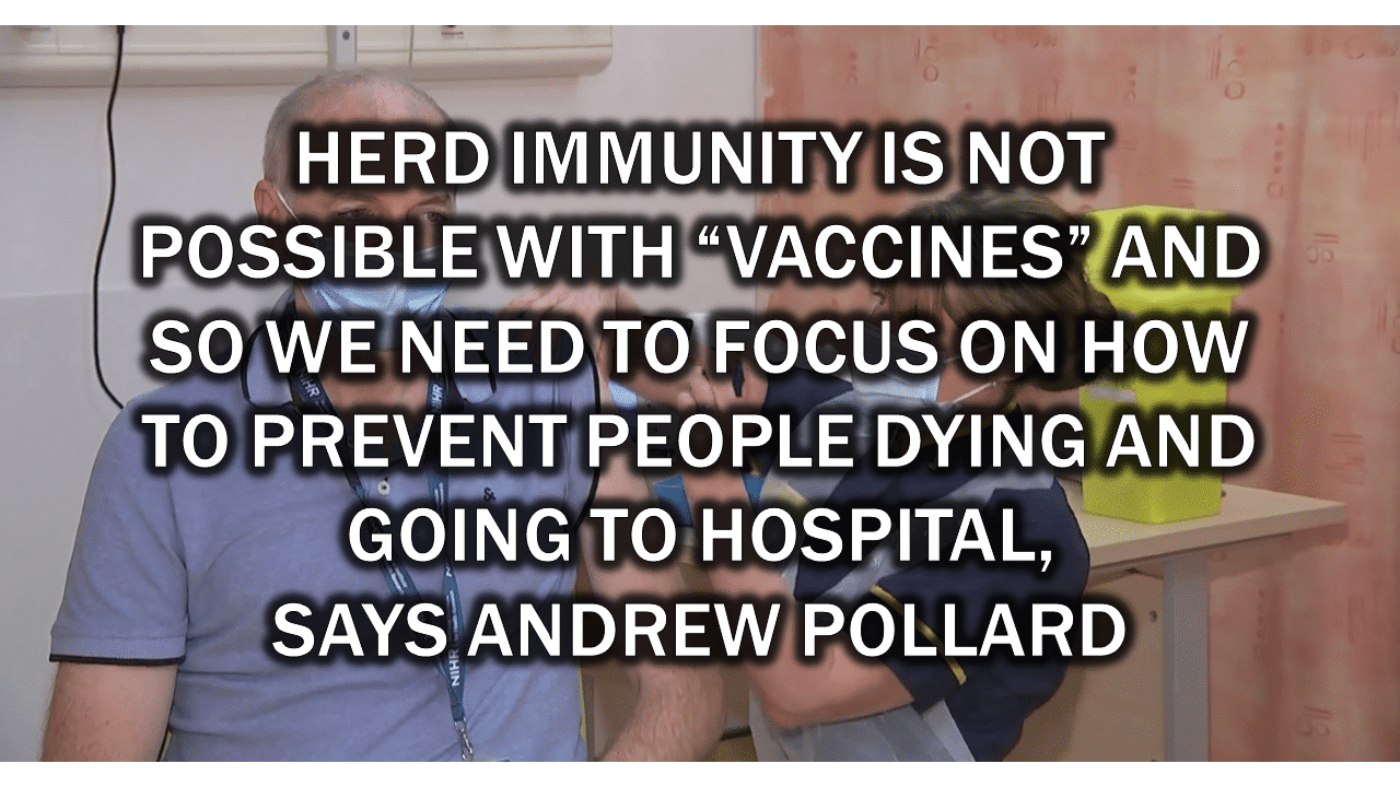 It comes as no surprise, then, that Pollard is now stating the mass vaccination programme will not achieve “herd immunity.” However, it is surprising Pollard’s solution is that the only way forward is to focus on how to “prevent people dying and going to hospital”. We were led to believe that this was the focus for the past 18 months – to the detriment of all else – to “save lives”.