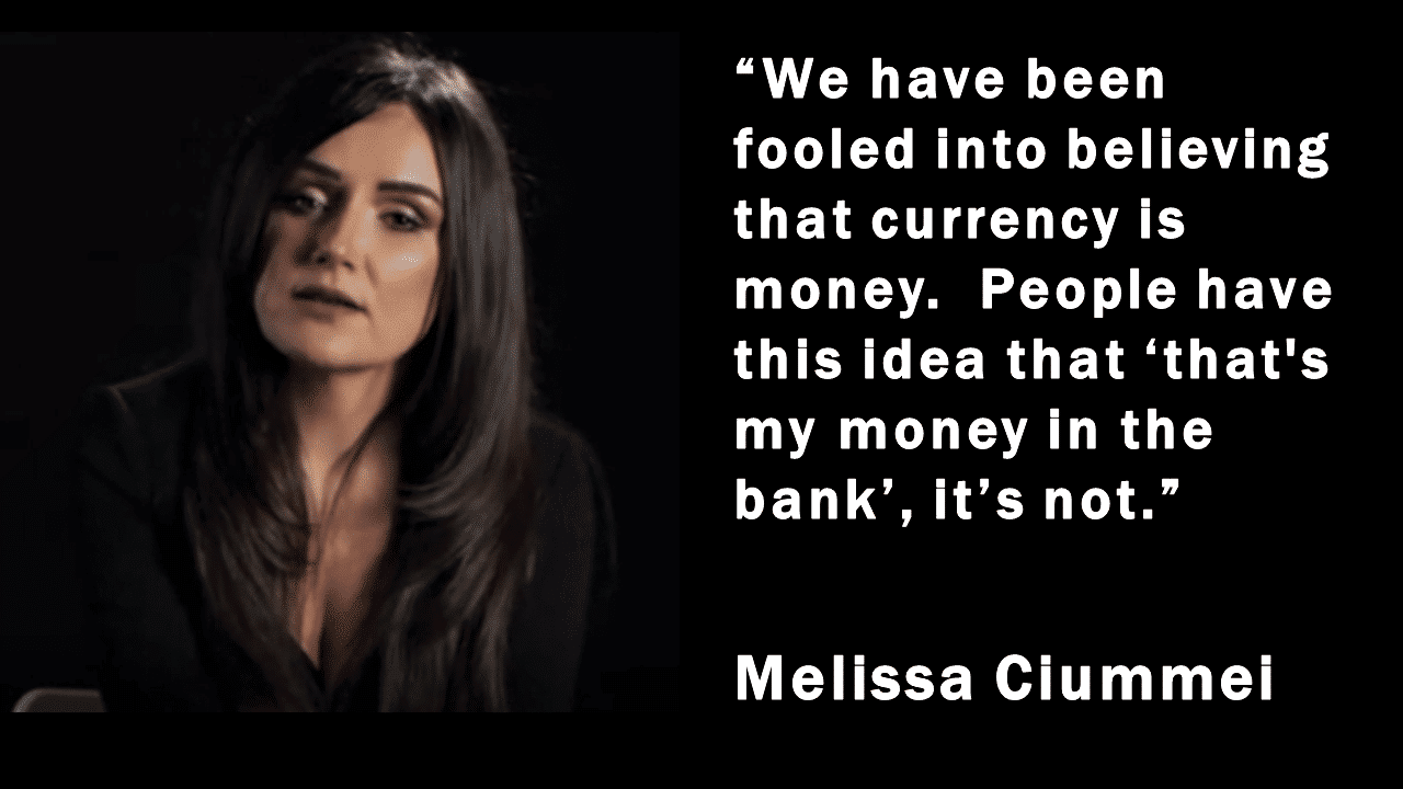 “We have been fooled into believing that currency is money. People have this idea that ‘that’s my money in the bank’, it’s not. Should that bank become insolvent you will be given shares of an insolvent bank currency representing money,” Ciummei said. Watch her interview below: