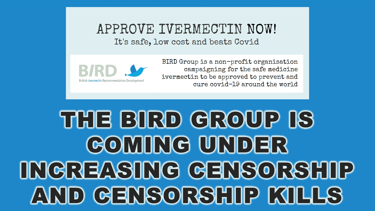 The British Ivermectin Research Development (“BIRD”) Group has been coming under increasing censorship in recent months. In May the BIRD Group noted the increasing censorship on LinkedIn around ivermectin. In July the BIRD Group noted that the World Health Organisation was deleting information on it’s website saying ivermectin is safe and on 1 October twitter suspended BIRD’s account.
