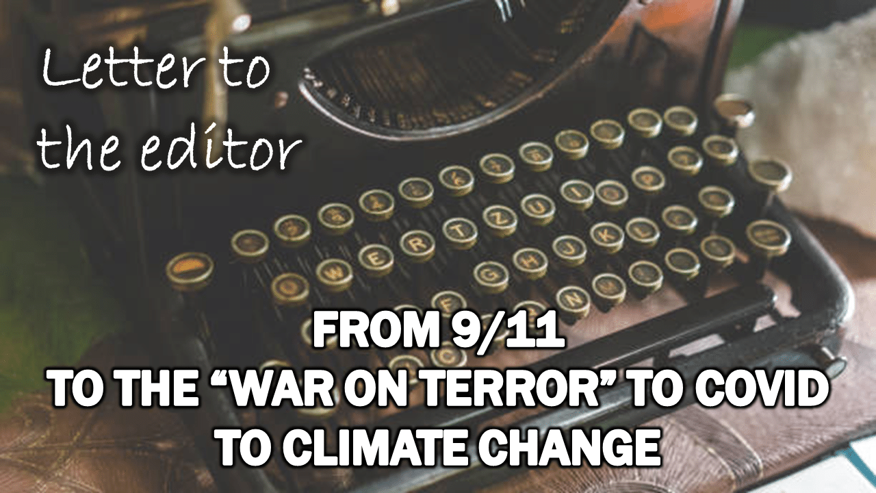 “The ‘war on terror’ led to three major things,” he writes and “this leads us neatly to the ongoing fear campaigns, one the war on Covid and other “deadly” biomedical threats and two, the campaign to save the planet from the deadly effects of C02.”