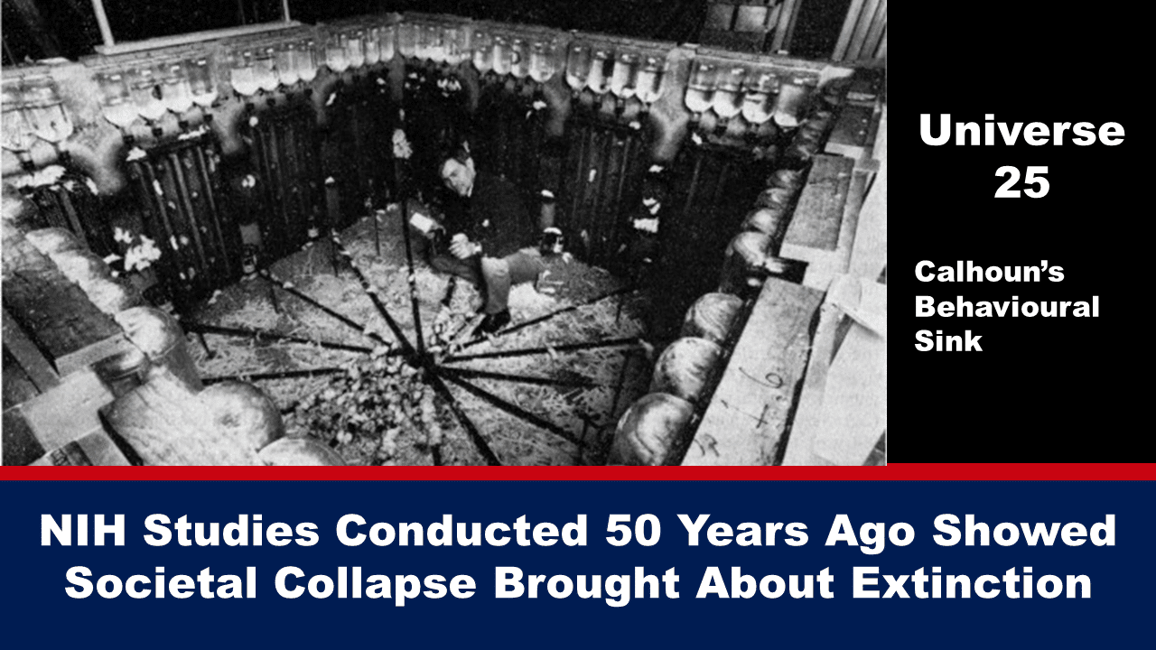 In 1972, he created his “Mortality-Inhibiting Environment for Mice.” In his most famous experiment in the series, “Universe 25”, the population peaked at 2,200 mice and thereafter exhibited a variety of abnormal, often destructive, behaviours including refusal to engage in courtship, females abandoning their young, and homosexuality. By the 600th day, the population was on its way to extinction. Though physically able to reproduce, the mice had lost the social skills required to mate.