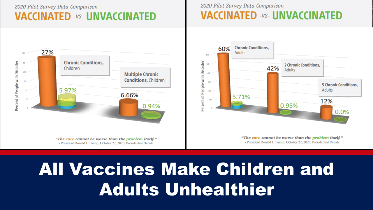 “What we found was that whether it was asthma, allergies, breathing issues, behavioural issues, ADHD, infection … any infection, or allergy stuff like eczema skin problems and even anaemia in childhood – all those conditions … the more time, the more vaccines, the more problems. And almost flat line, almost no problems for the unvaxxed.