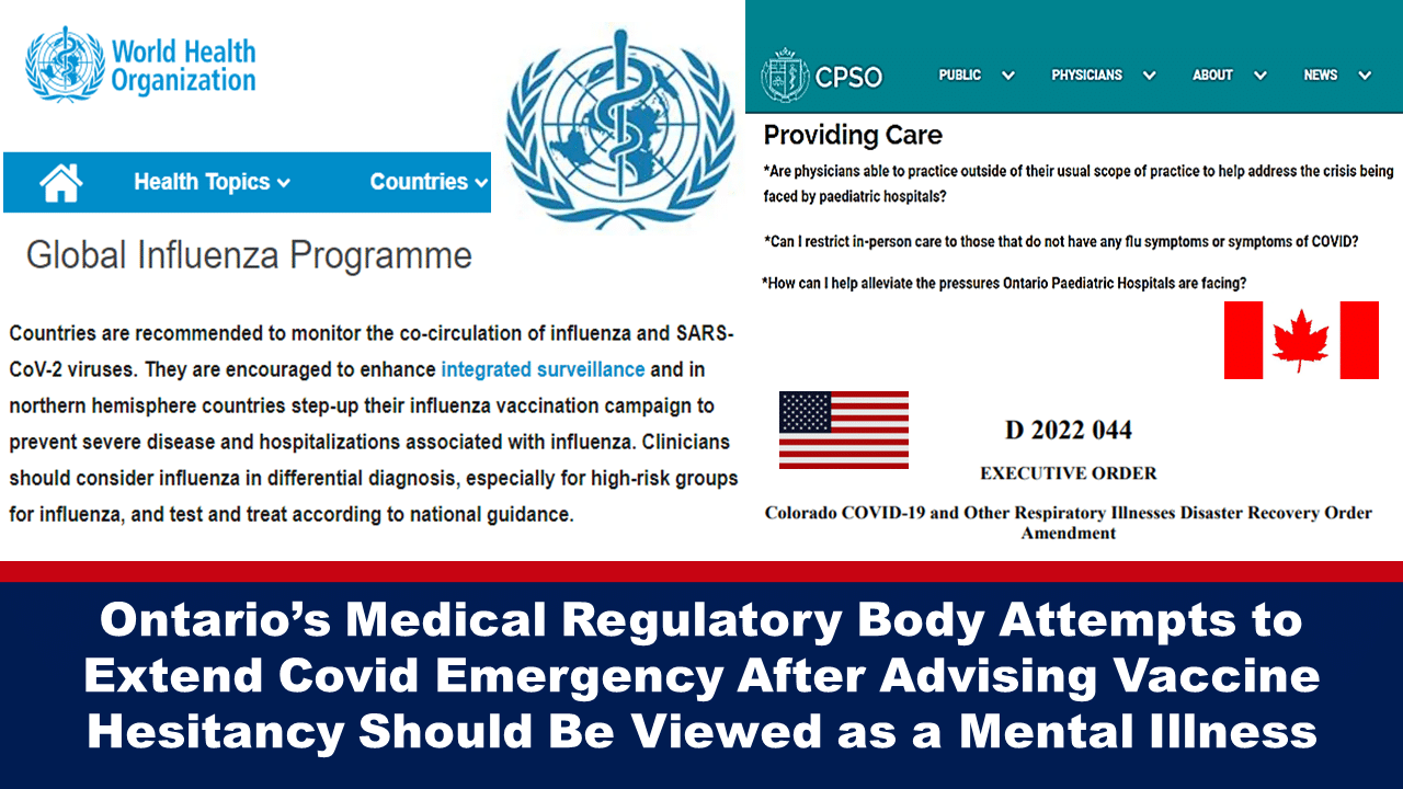 Echoing moves recently made by Colorado’s Governor through an Executive Order, Canada’s College of Physicians and Surgeons of Ontario (“CPSO”) attempts to prolong the Covid “emergency” by updating their Covid advice to include “flu symptoms” and how to manage the “crisis” in paediatric hospitals.