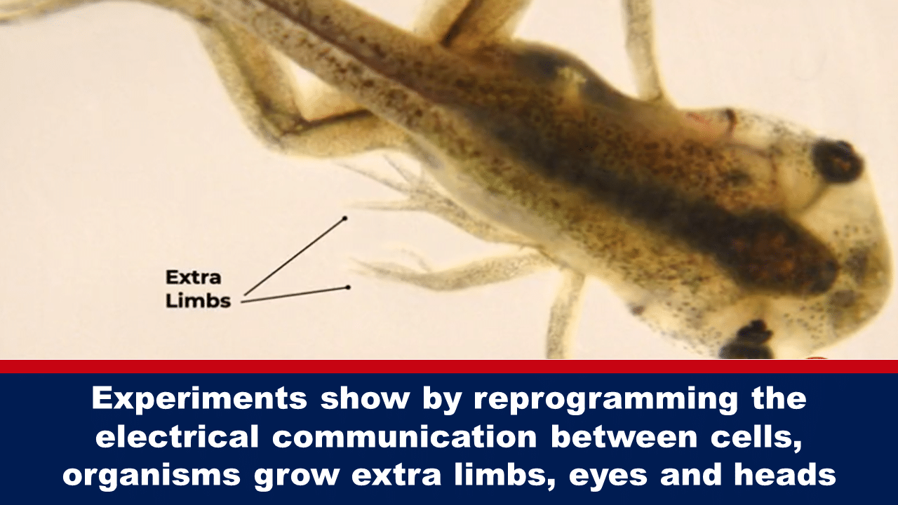Cells communicate with each other and coordinate their activities through electrical signals. Levin has figured out that it is the electrical components of cells – miniature transistors – that contain the functional memory of how to put together the building blocks of life generated by DNA. By stimulating the cellular transistors of a growing organism, you can create novel electrical gradients in the whole network of cells that stimulate particular organs and organ systems to appear in unexpected places. Levin shows pictures of a tadpole that has been programmed to develop a functioning eye in its gut for example.