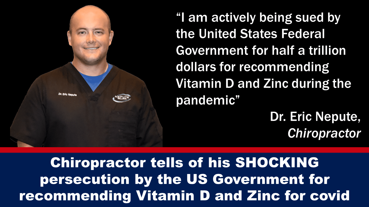 American chiropractor Dr. Eric Nepute gave a shocking account of the US Federal Government suing him for recommending Vitamin D and Zinc to prevent and treat covid during the covid pandemic. The Government is suing him for half a trillion US dollars – $,500,000,000,000 – for 12,555,000 violations. And that is just the start of the persecution of Dr. Nepute. It gets worse, much worse.