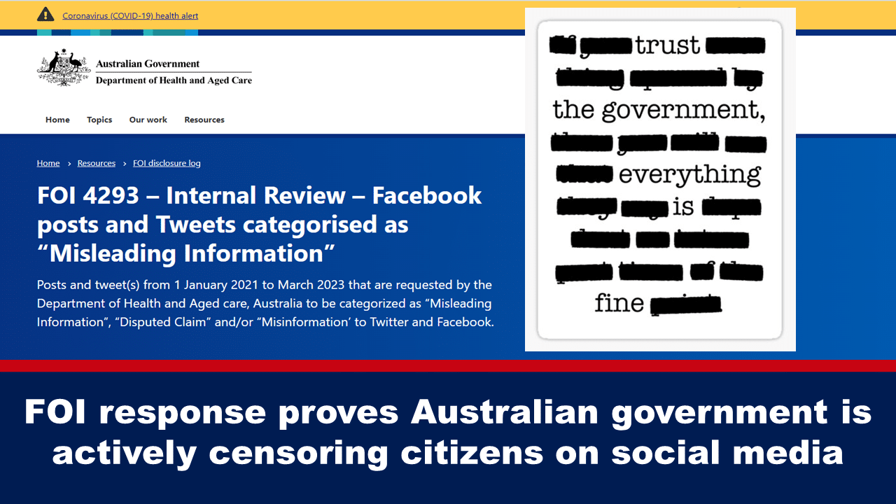 Yesterday, a response was received to a Freedom of Information Act (“FOI”) request which includes evidence that the Australian Department of Health and Aged Care (“DHAC”) were colluding with Facebook to censor posts about covid vaccine injuries. The FOI response is heavily redacted but the evidence is clear.