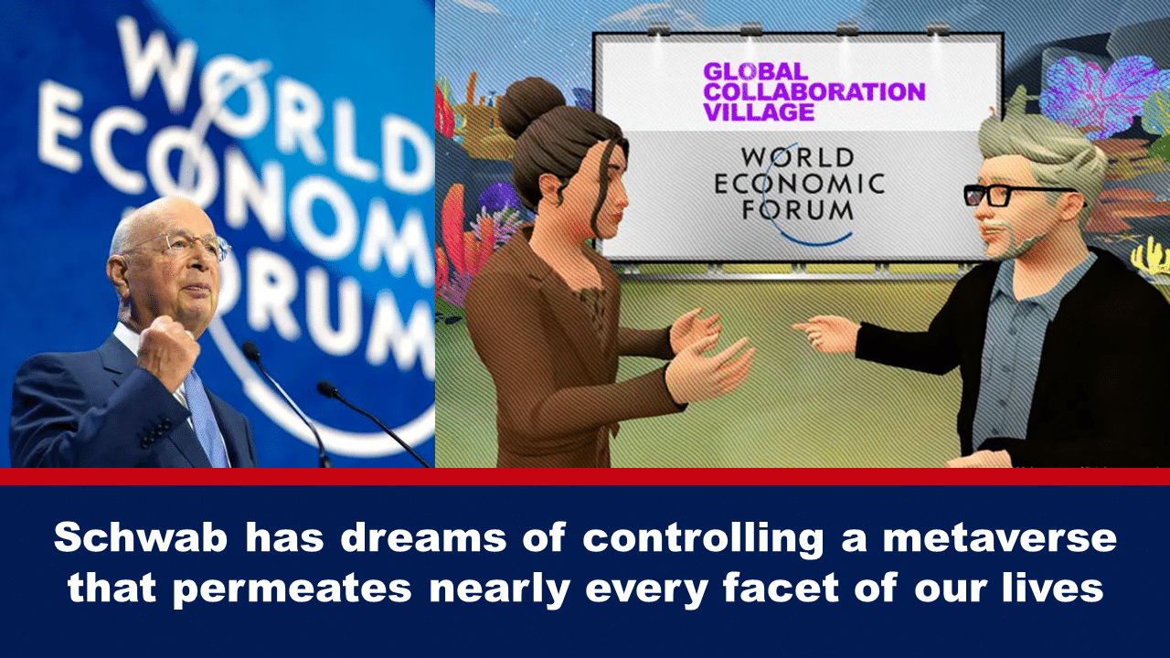 Featured image: Klaus Schwab (left). WEF Sets up Its Own Metaverse Global Collaboration Village (right)