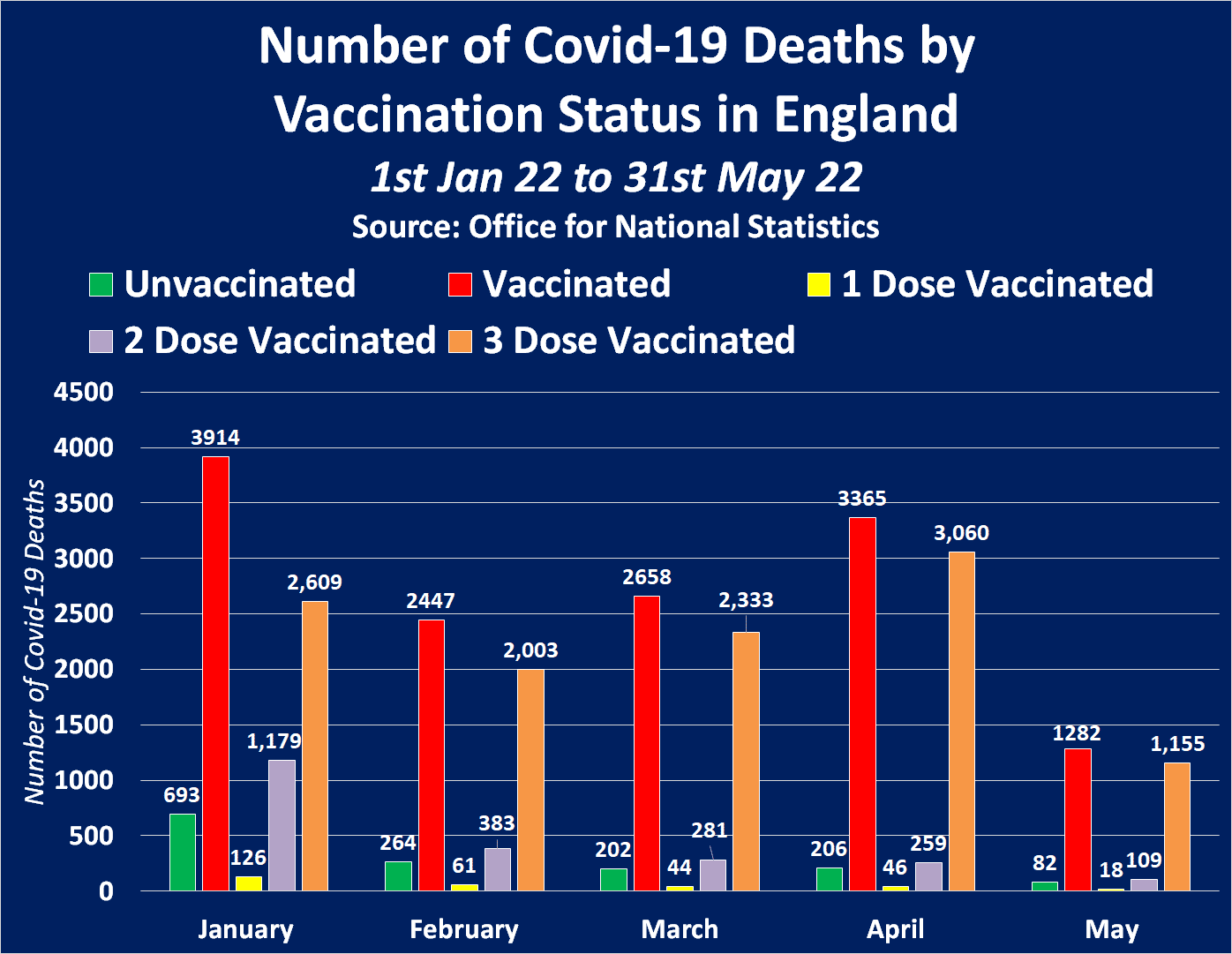 By the end of May 2022, England had suffered 15,113 Covid-19 deaths, and the vaccinated accounted for a shocking 13,666 of them. The majority of them among the triple vaccinated every single month.