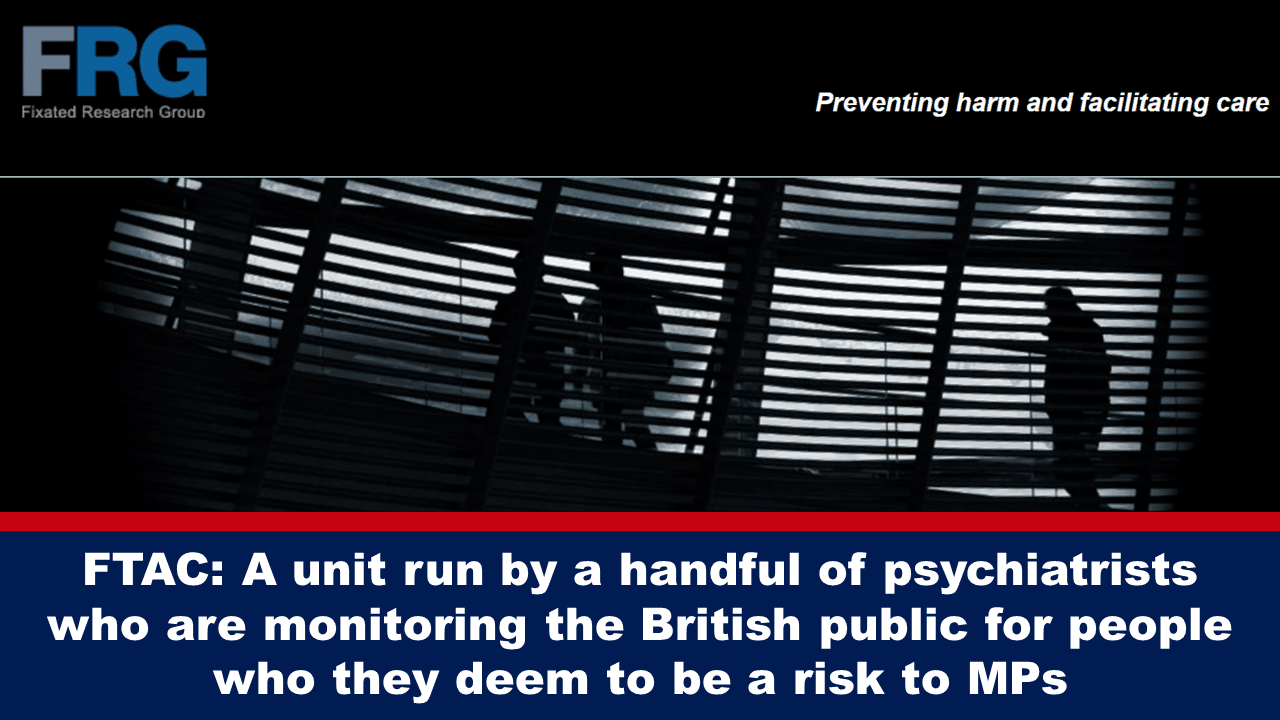 It is run by a small group of five psychiatrists known as Fixated Research Group (“FRG”) – only two of whom are British. Yet this small, mainly non-British, group monitors British citizens who challenge politicians and get too close.