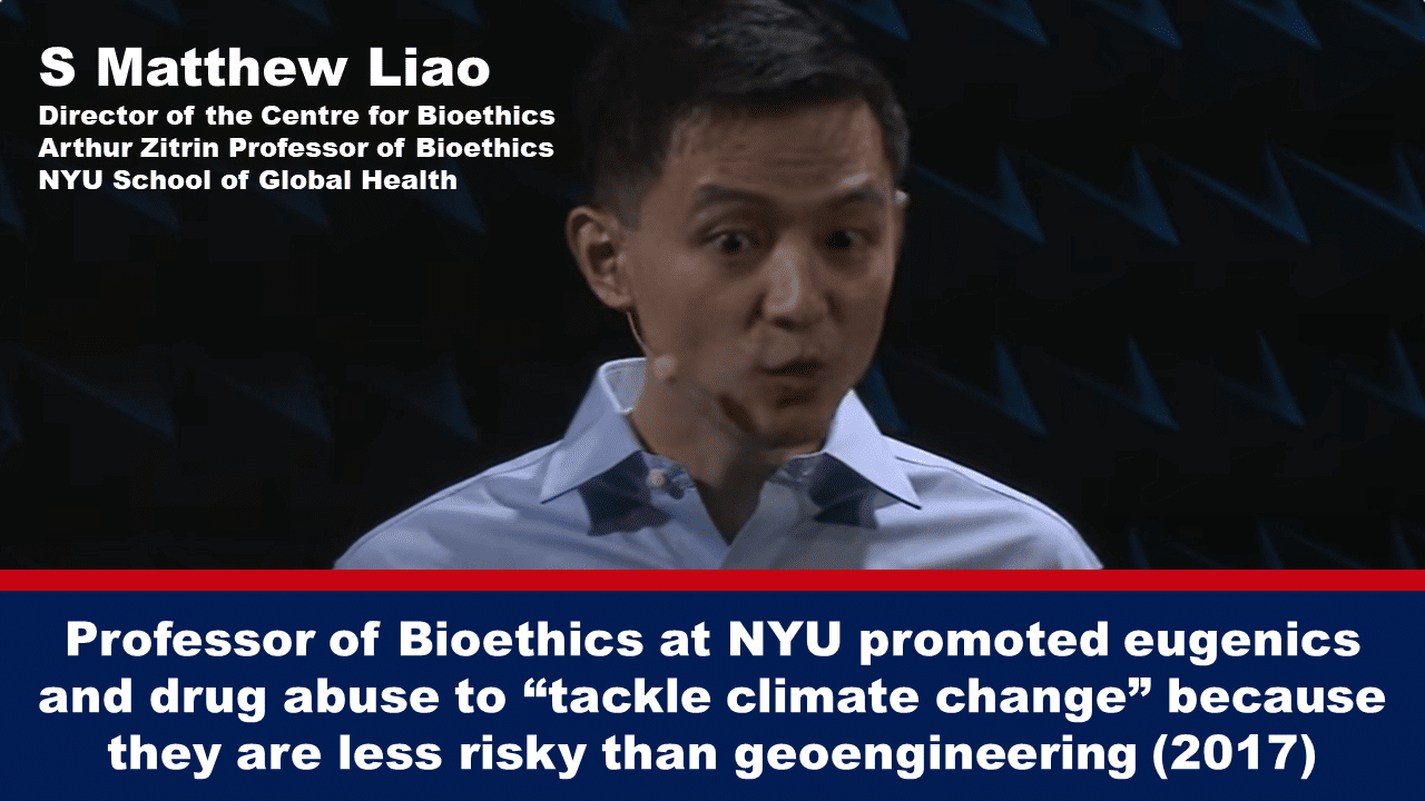 In December 2016, Liao openly discussed using genetic engineering of humans to “address climate change” at the World Science Festival. He gave two examples of how editing the human genome could mitigate “climate change.”