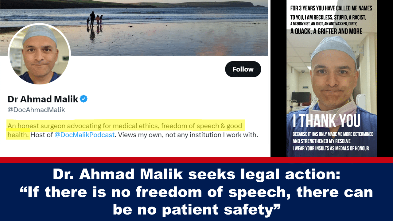 Dr. Ahmad Malik is a UK Orthopaedic Surgeon who has been practising for 25 years. He was suspended without pay and cancelled because he dared to challenge the UK government’s narrative. He has defended informed consent, opposed mandates and lockdowns, questioned experimental injections and insisted that there are only two biological sexes.
