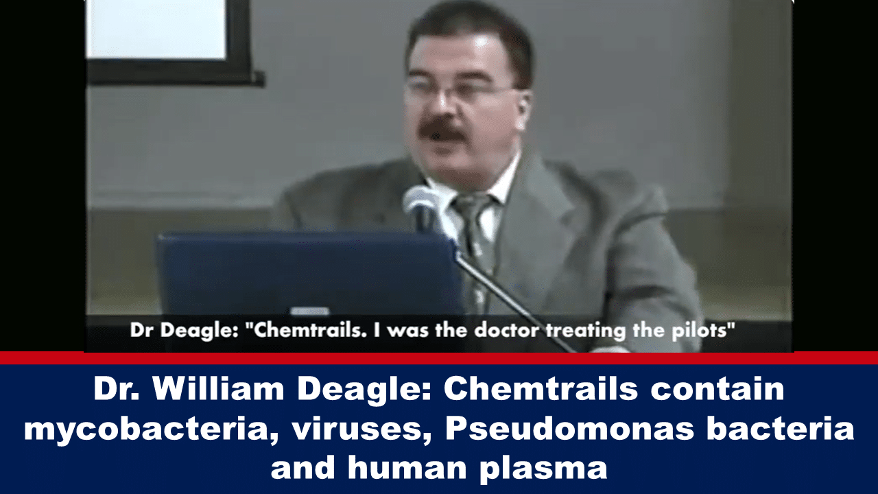 During a speech in 2006, Dr. William Deagle spoke about chemtrails. He said that chemtrails contained barium salts, mycobacteria, viruses, Pseudomonas bacteria and human plasma.