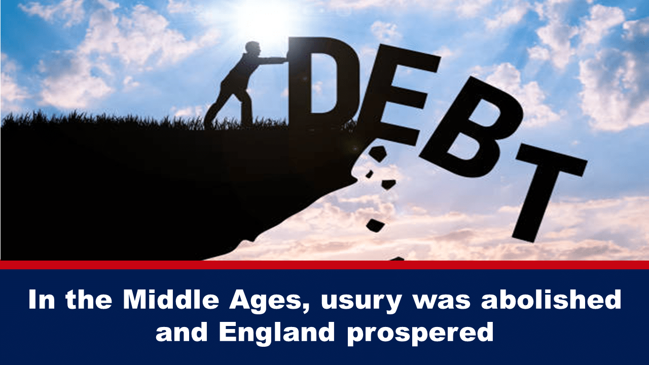 When usury, the practice of lending money and charging the borrower interest, was abolished in England in the 15th century, taxes were moderate and there was no state debt. With tolerable taxes, no state debt and no interest to pay, England enjoyed a period of unparalleled growth and prosperity.