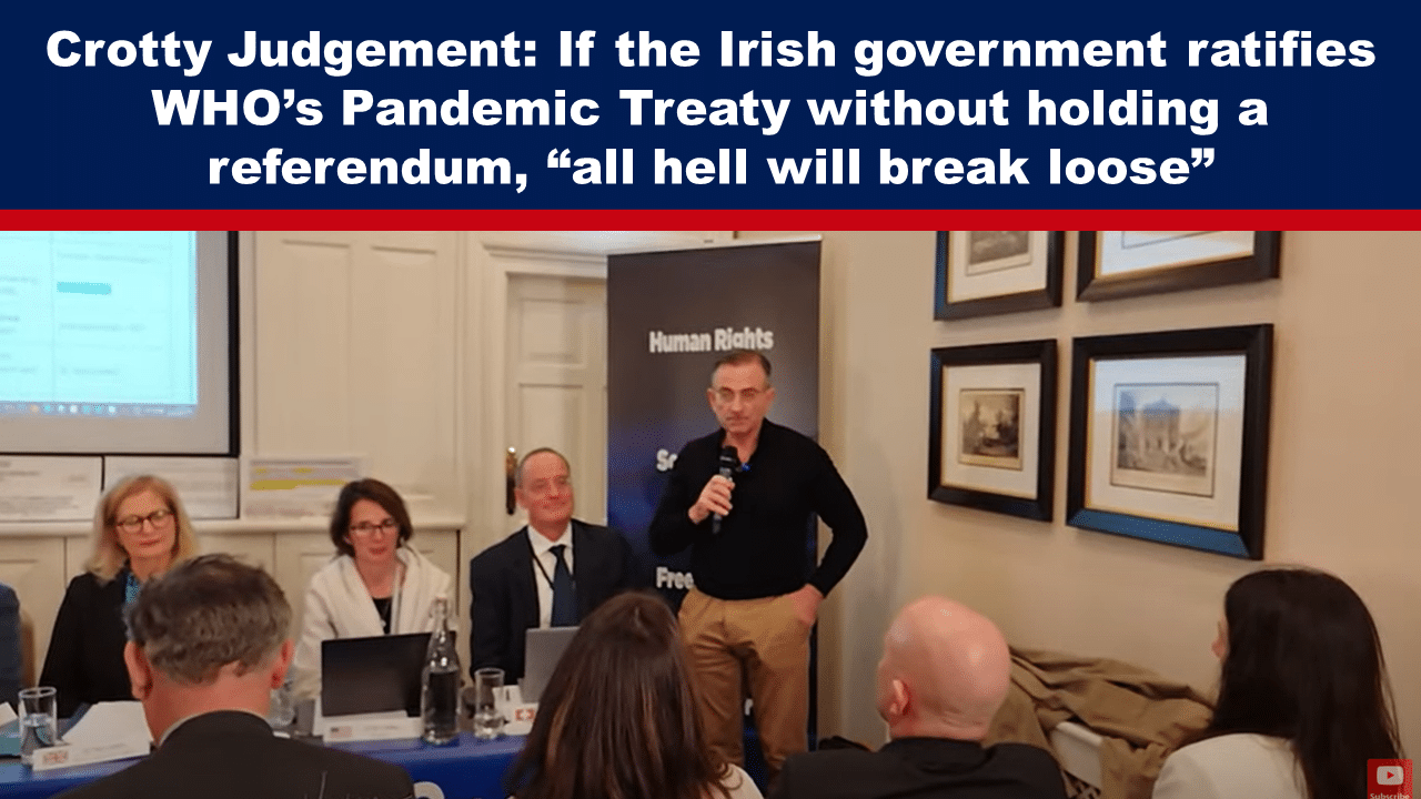 Below is a short video report by Ivor Cummins from the presentations at the Irish parliament on WHO’s Pandemic Treaty held earlier this week, on 6 February. It includes an explanation of the Crotty judgement by Irish author and presenter Eddie Hobbs.