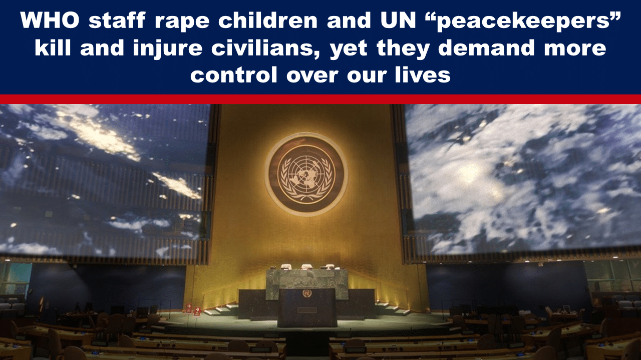 “WHO staff rape children and UN “peacekeepers” kill and injure civilians, yet they demand more control over our lives”Of course, because the WHO is a organization of the UN, and what is the UN?