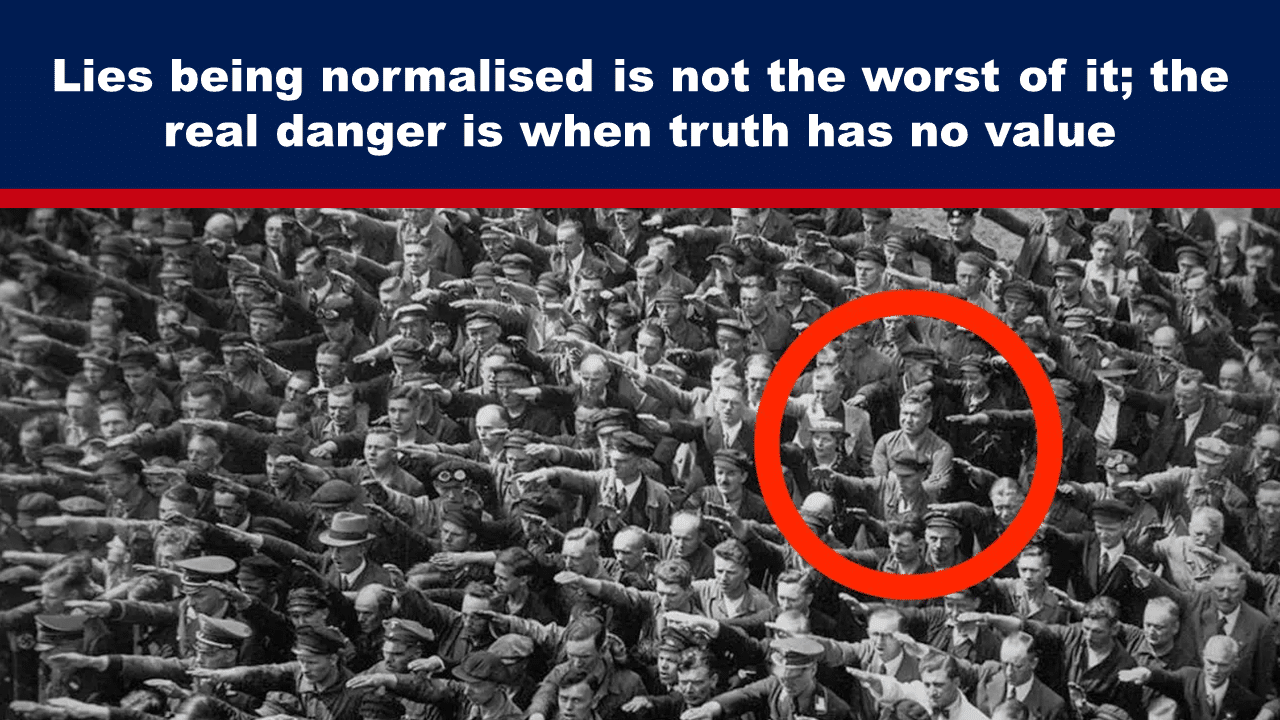 However, the frightening part is not the lies; it is when truth loses its value. As history has taught us, a disregard for truth can lead to dangerous consequences.
