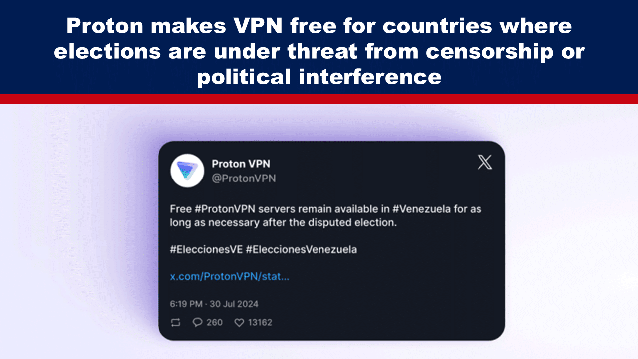 Proton, an alternative to Big Tech for over 100 million people worldwide, is making Proton VPN free in 20 countries with a history of censorship or political interference that have elections this year. The hope is that with online freedom and privacy protected, democracy can thrive.