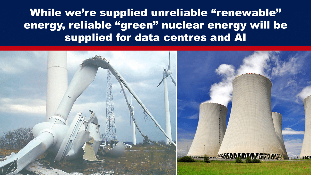 What this all seems to point to is that it will be largely unreliable and intermittent “renewable” wind and solar power for the public use but the vast amounts of reliable energy required for AI will be obtained from what has now been widely labelled as “green,” “clean” nuclear power.