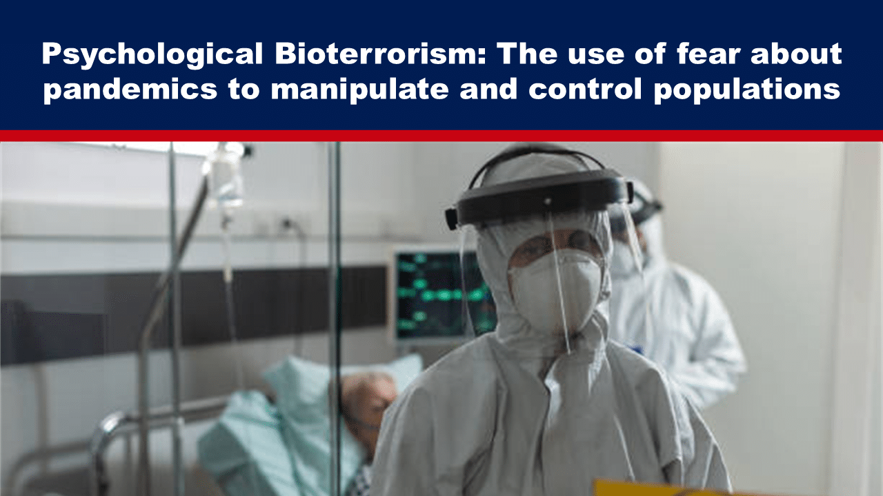 Psychological Bioterrorism is the use of fear about a disease by governments and other organizations, such as Big Pharma, to manipulate individuals, populations, and governments. Although the fear of infectious disease is an obvious example, it is not the only way psychological bioterrorism is used.