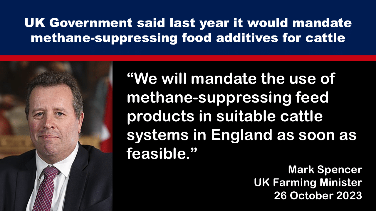 In an October 2023 press release published under the Sunak Conservative government, Defra committed to working with industry to deliver further action to reduce methane emissions in livestock through the use of methane-suppressing feed products in England.