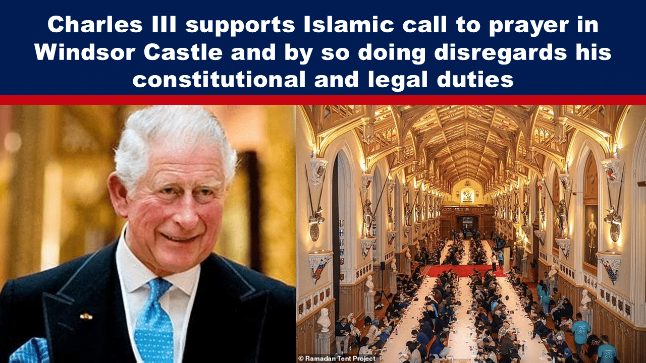 King Charles III’s role as Defender of the Faith, the Christian faith, is called into question following an “Islamic call to prayer” held at Windsor Castle during a Ramadan fast-breaking event.