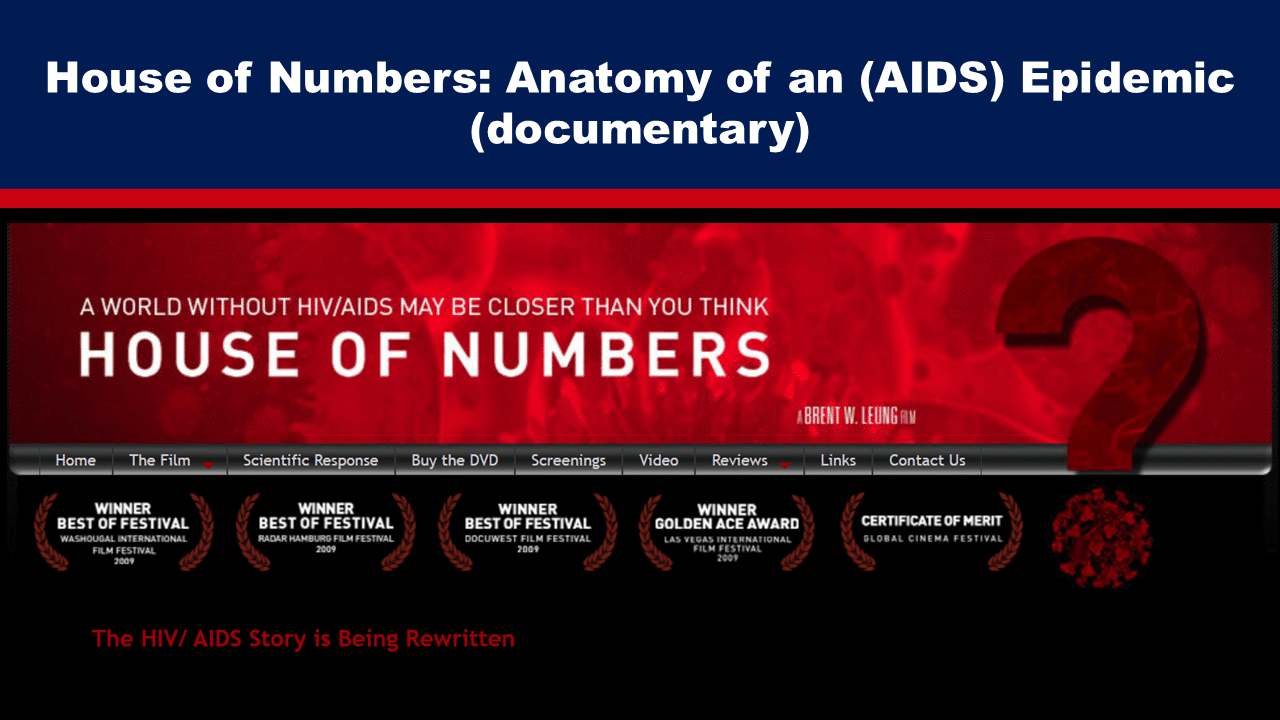 The HIV/ AIDS documentary ‘House of Numbers: Anatomy of an Epidemic’ premiered in January 2010. It documents Canadian filmmaker Brent Leung’s worldwide journey, from the highest echelons of the medical research establishment to the slums of South Africa, to answer the questions: What is HIV? What is AIDS? What is being done to cure it?