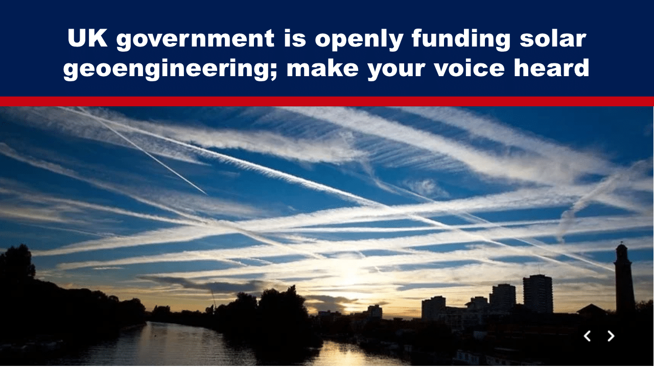 Don’t let them get away with it. Take this opportunity to let them know that your attitude to geoengineering is that you strongly object.  On Chemtrails Project UK’s website is a ‘Take Action’ tab; one option is to send the Directive to your Member of Parliament, another is to sign a petition (although the website doesn’t appear to have been active since 2021 so it’s not certain if any action will be taken with this petition).  You can also sign a petition to the UK Parliament titled ‘Make all forms of ‘geo-engineering’ affecting the environment illegalHERE.