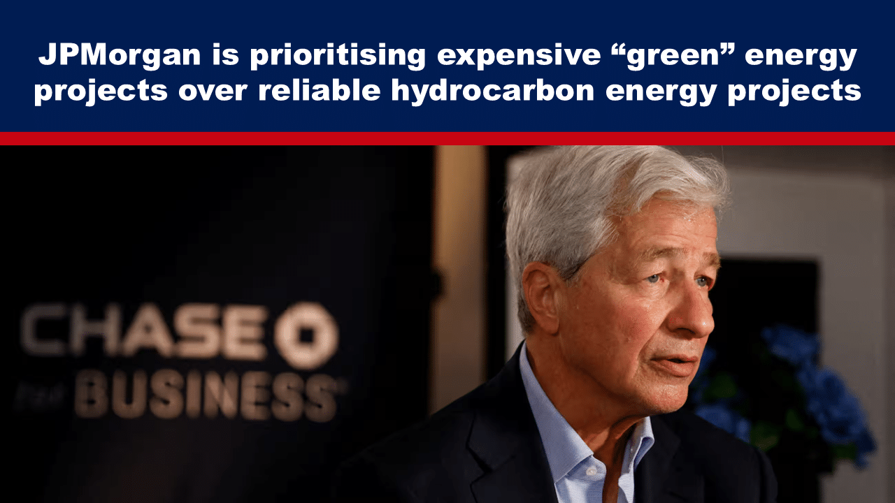 JPMorgan is arguably the largest bank in the world. Last week, its Chairman Jamie Dimon dismissed concerns over the bank financing “green” energy projects by 29% more than cheaper, reliable hydrocarbon energy sources.