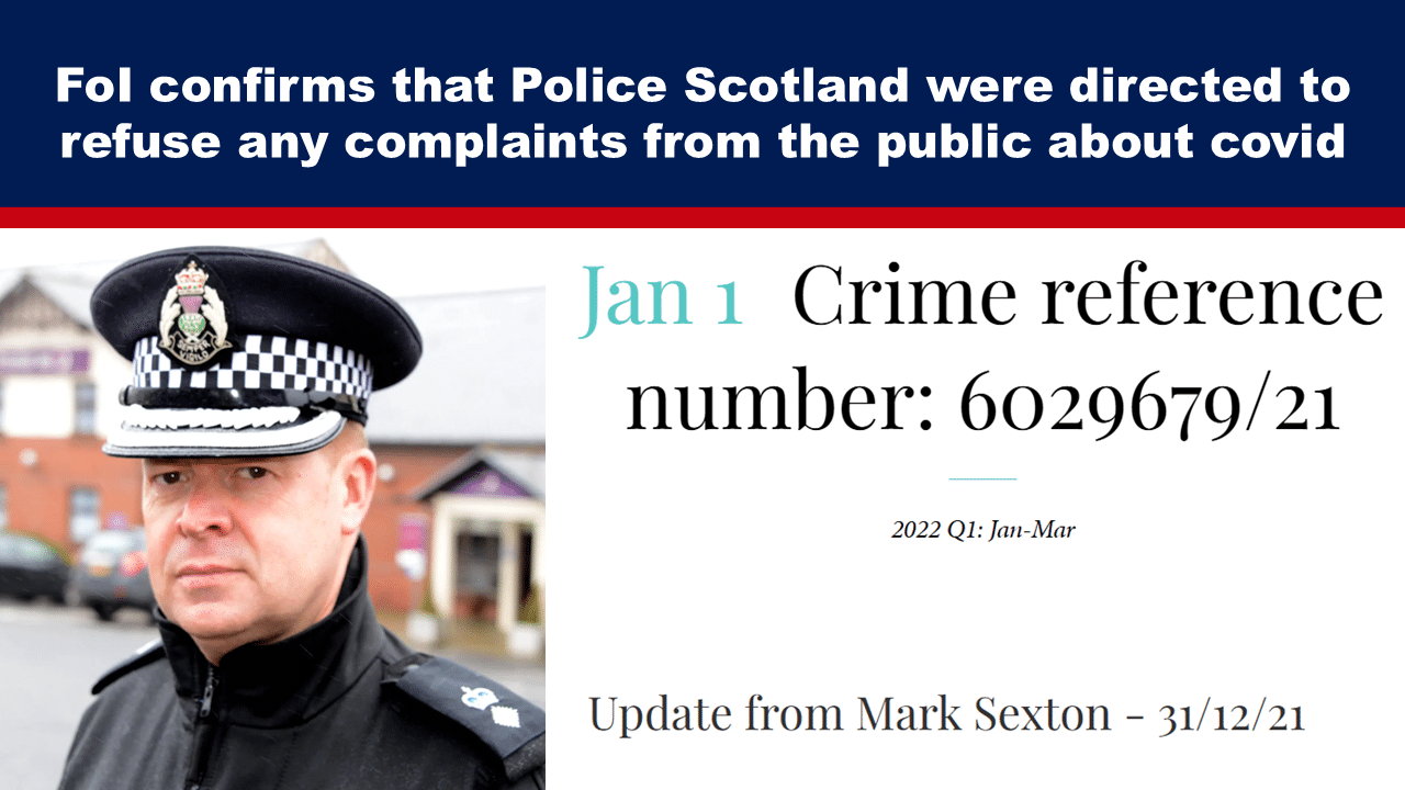 The request was made after Mark Sexton posted a video of a police officer stating that Police Scotland’s Assistant Chief Constable (“ACC”) Alan Speirs ordered all officers not to accept or deal with covid or covid vaccine related crime submissions.
